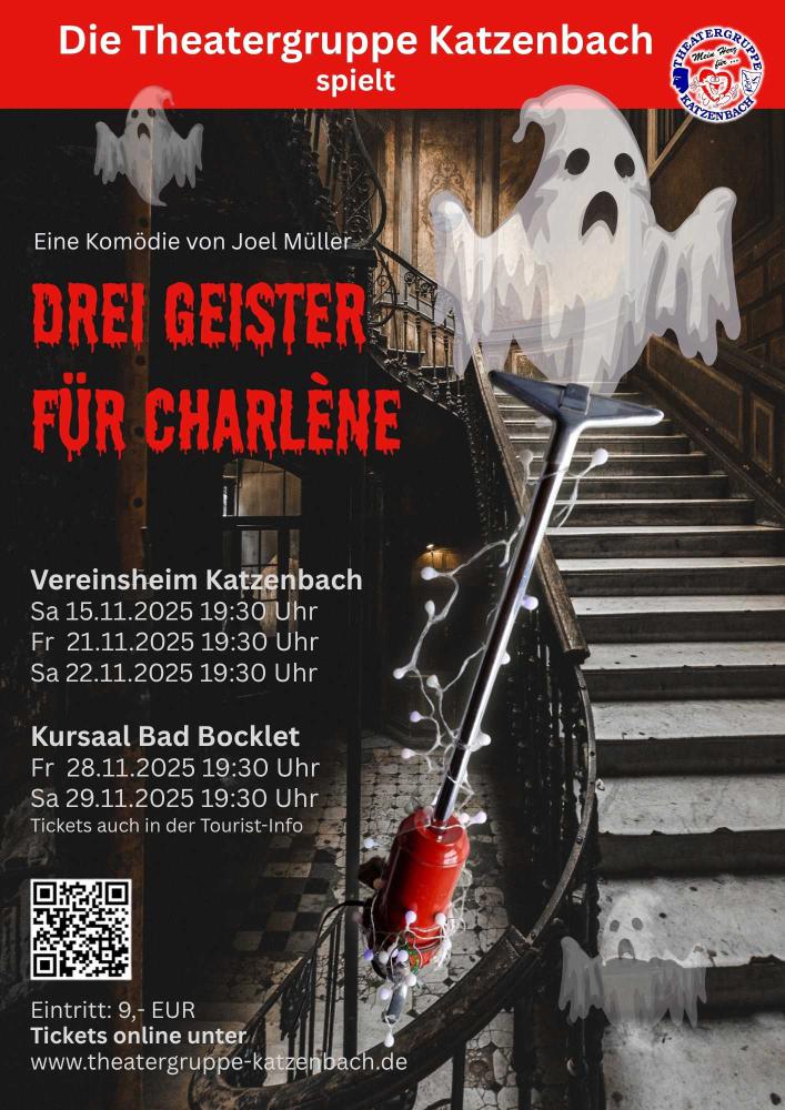 Die Theatergruppe Katzenbach präsentiert 2025 "Drei Geister für Charlène" von Joel Müller.